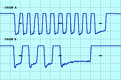 Note: When looking through examples on this website, you'll notice I use a few tricks when implementing an open-collector interface with PIC microcontrollers. I use the same pin for both input and output, and I enable the PIC's internal pullup resistors rather than using external resistors. A line is pulled to ground by setting the corresponding pin to output, and writing a zero to that port. The line is set to the high impedance state by setting the pin to input. Taking into account the PIC's built-in protection diodes and sufficient current sinking, I think this is a valid configuration. Let me know if your experiences have proved otherwise.