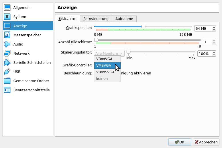- Bei Darstellungsproblemen gegebenenfalls via Rechtsklick und Ändern auf die Einstellungen der SPiC-Editor VM in VirtualBox wechseln, dort unter Anzeige den Grafik-Controller wechseln und die VM starten