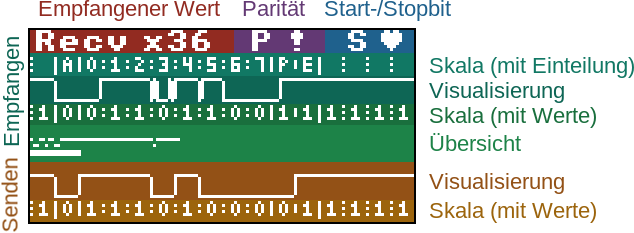 Recvin der ersten Zeile gibt den empfangenen Wert an der derzeit ausgewählten Position an, z.B.Recv x17zeigt den Empfang der (dezimalen) Zahl 23 an (≙ 17₁₆). Nicht eindeutig dekodierbare Daten werden mitRecv ??gekennzeichnet. - Anschließend wird ein korrektes (gerades) Paritätsbit mit einem
