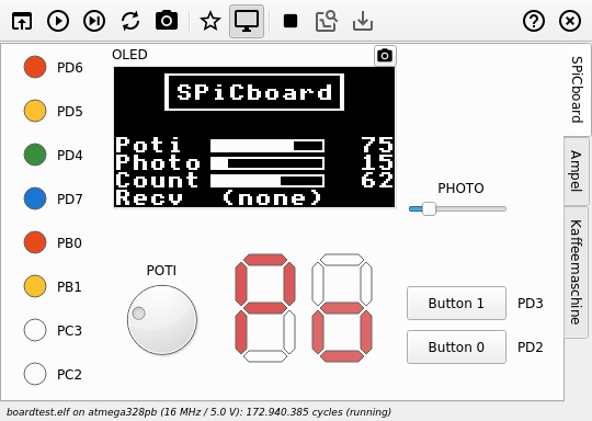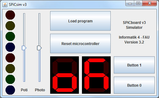 Der SPiCsim ist ein Simulator für das SPiCboard. Es unterstützt sowohl den mit dem aktuellen SPiCboard v3 verwendeten Mikrocontroller (ATmega328PB), als auch alle auf dem SPiCboard verwendete Peripherie (LEDs, Potentiometer, usw.). Binärdateien, die auf dem SPiCboard lauffähig sind, können unverändert in den SPiCsim geladen und getestet werden. Dies ist insbesondere praktisch, wenn gerade keine echte Hardware zum Testen zur Hand ist.